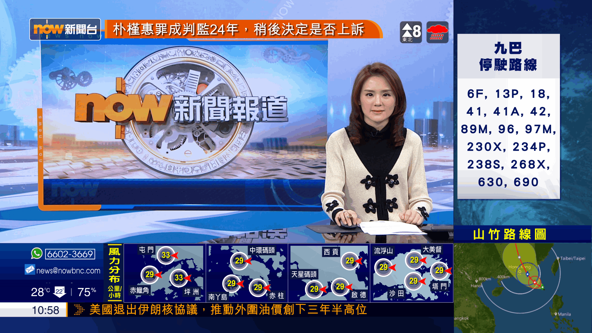 In order to offer viewers important updates during severe weather season Now TV requested the implementation of a ticker system that allowed them to display Typhoon Tracks, Precipitation Levels, Satellite and Radar Images as well as regional wind maps and weather cams of different areas of Hong Kong. The system was fully automated updating with real time breaking news from octopus by the journalists and weather data from HKO (Hong Kong Observatory)